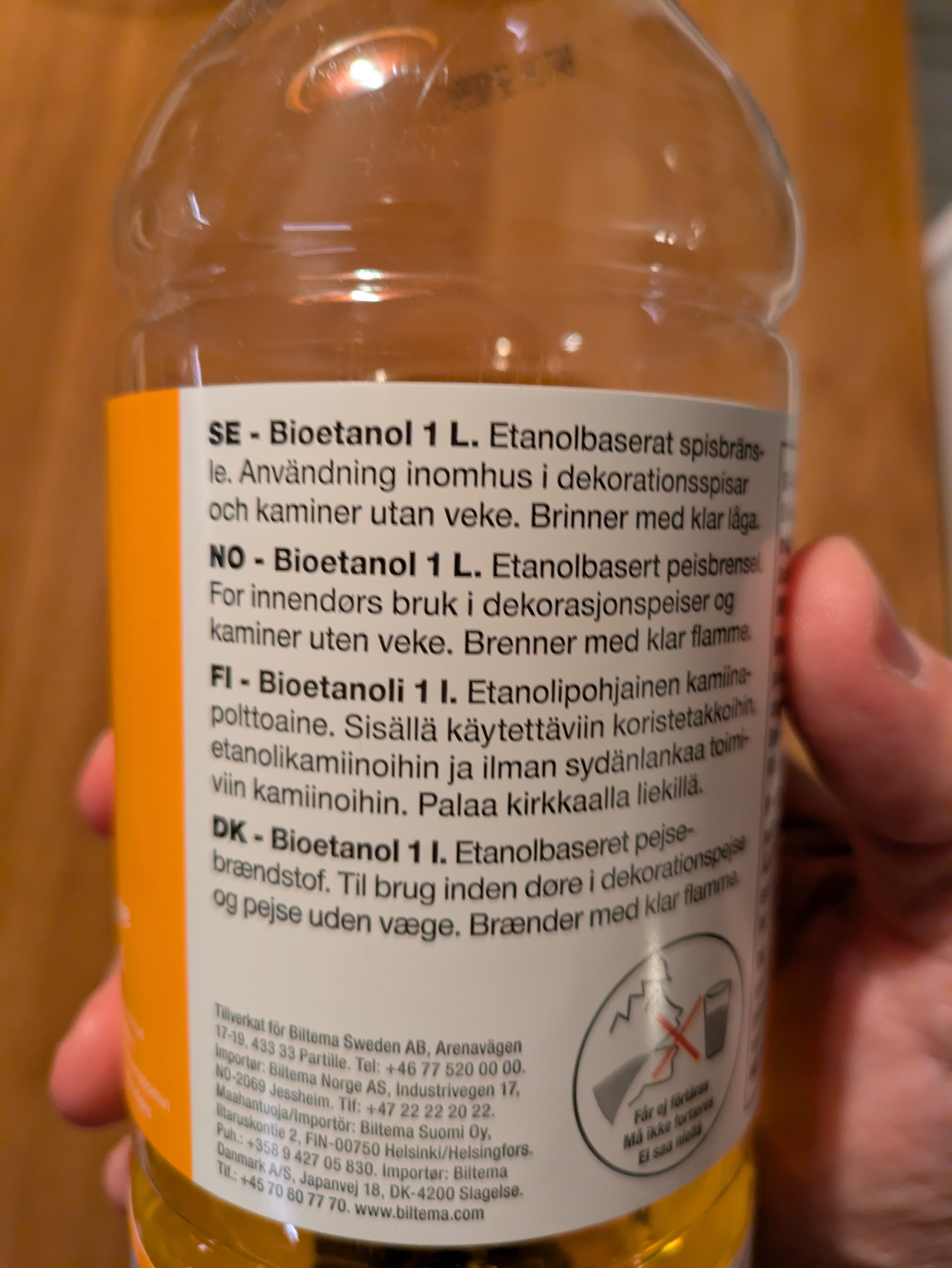 Omnilite Skrevet 3. april 2025 Skrevet 3. april 2025 dsk skrev (32 minutter siden): Det er mange år siden jeg testet, og den gangen var jeg skuffet. Teoretisk så er det sprit (etanol) fremstilt av organisk materiale. Således kunne kanskje hjemmebrent kalles bioethanol? Det er utfordringen er hva de siste prosentene er som ikke er sprit. Er det over 85% sprit så går det antagelig rimelig bra. Hva tror du om denne, er 99.7% teknisk alkohol? Fra Thansen 129,- Er selvsagt risk for at den inneholder noe lurium som ikke er helsebringende..