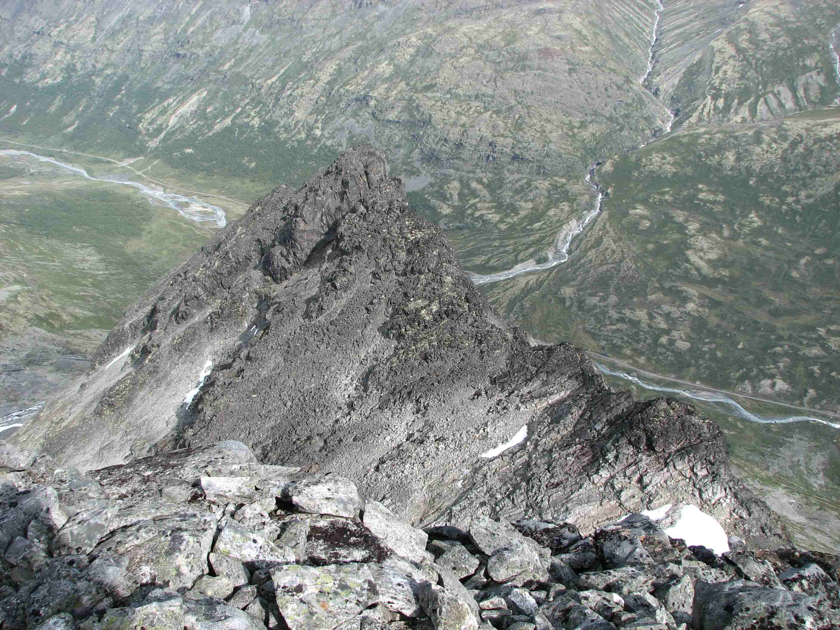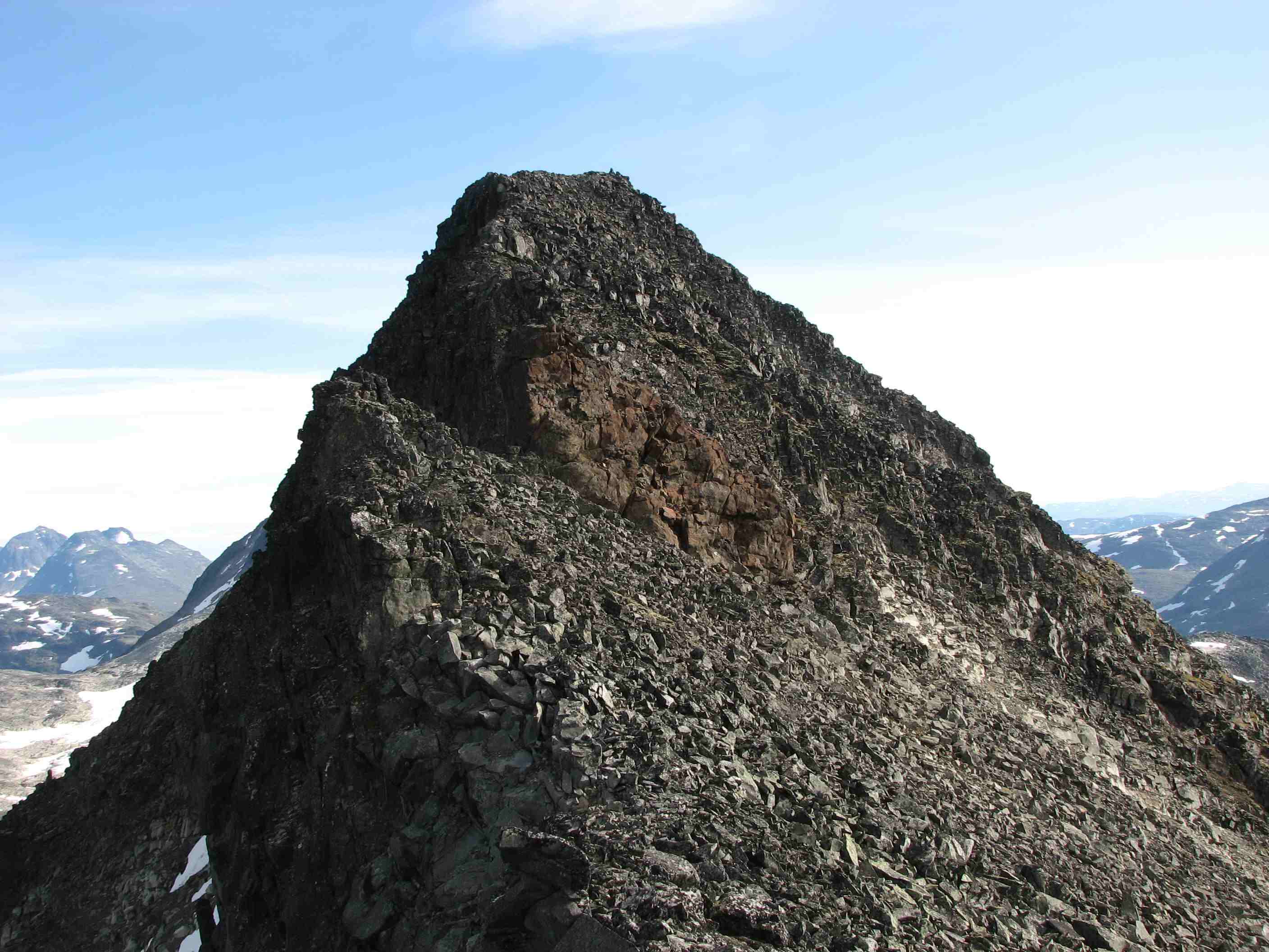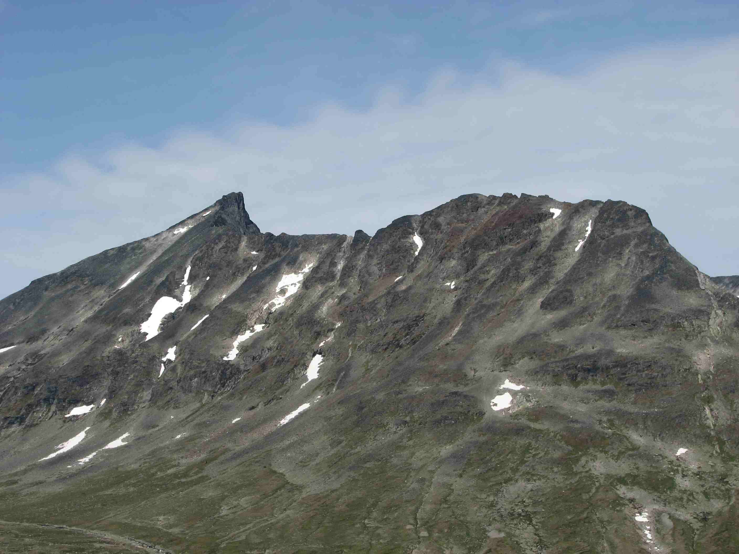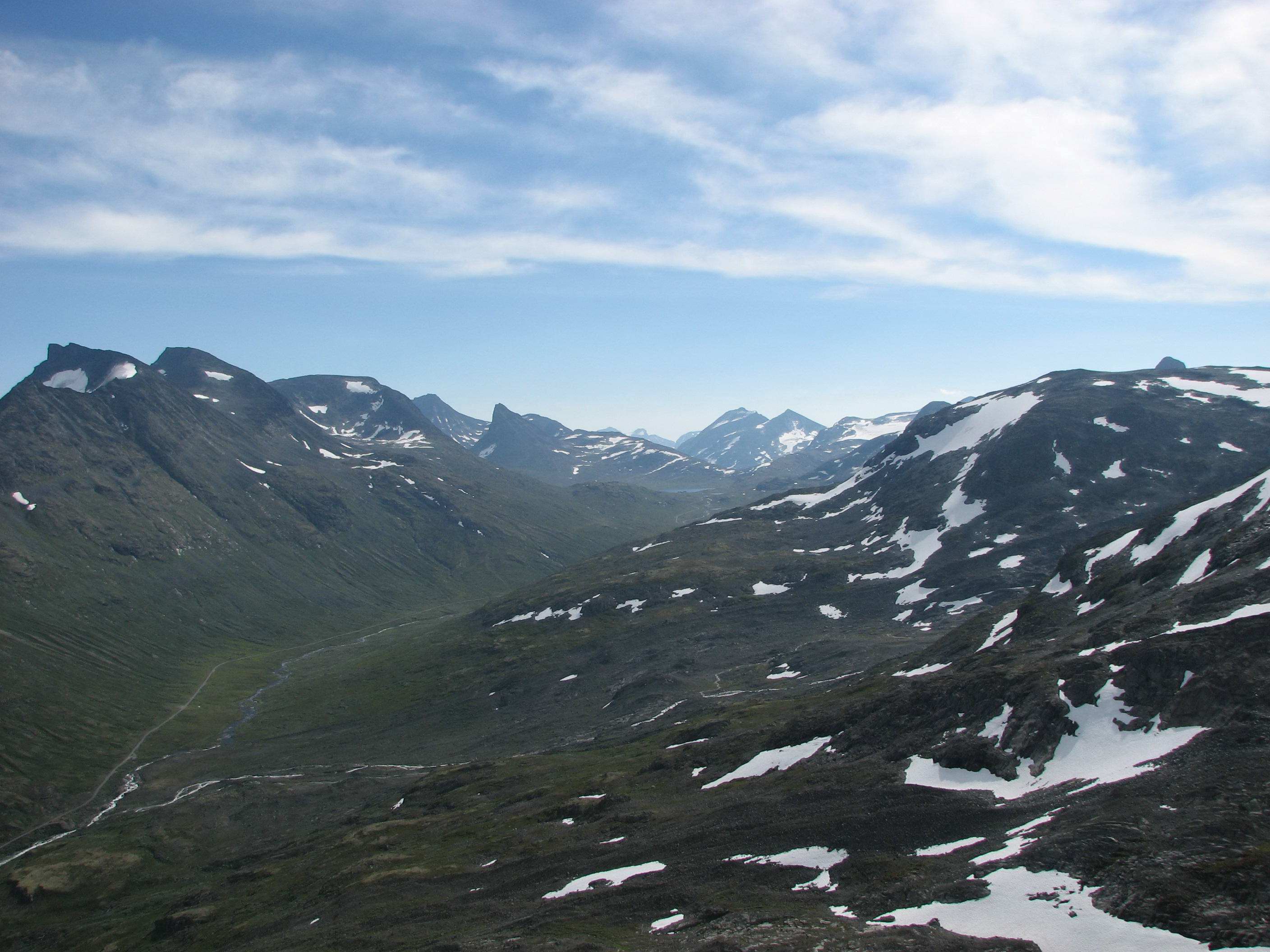 Sigbjørn Skrevet 2. september 2007 Skrevet 2. september 2007 Litt forseinka turrapport frå 23-24.august dette, og ut frå turrapportane på forumet frå sist veke ser det ut som vi fekk dei siste sommardagane i fjellet denne sesongen. Sidan sommaren ikkje hadde bydd på fleire godversdagar enn strengt tatt naudsynt, var fjellabstinensen ganske sterk. Når vermeldinga tilsa knallver i fjellet var det berre å sørge for å avspasere torsdag og fredag og kome seg avgårde til fjells. Lempa inn alt vi kunne kome til å trenge i bilen onsdag kveld og sette kursen mot Jotunheimen. Først på Sollihøgda begynte Øyvind og eg å diskutere mulige turmål, så vi hadde ikkje akkurat detaljplanlagt alt... Både Skagsnebba og Urdadalstindane hadde vi sett på fleire ganger før, så når ideen kom opp vart vi raskt einige. Rulla ut soveposane i friluft ved Lemonsjøen for å sove nokre timar, så bar det vidare til Leirdalen neste morgon.Dag I - Skagsnebba-Veslfjelltind-Loftet Parkerte ved Geitsetri og fekk spist frukost og smurt nistepakke før vi la avgårde. Planen var å gå opp søraustryggen til Skagsnebb. Over brua og kryssa Hurra uten problemer før vi la i veg inn dalen. Ca 1 km innover begynte vi å runde oppover, følgde nok sånn ca ruta som er skissert i Fjellbibelen til Morten. Fann iallefall ei grei rute oppover steinrøysa og vidare i ei renne som førte oss rett til toppunktet. Grei rute, men mykje laus stein å passe på uansett kor du går her...Slengte like godt på meg hjelm siden eg gjekk bakerst. Flott utsikt på toppen, men når vi skulle ta ein matbit fann Øyvind ut at nistepakka låg igjen ved bilen Sikkert ein sau som ville kose seg med den... Snill som eg er ofra eg halve matpakka mi, men eg har normalt halvparten så stor niste som Øyvind trenger så magen hans murra nok litt på slutten. Vidare mot Bakarste var det småsmalt i perioder, men greit på tørt føre. Omgjekk den raude hammaren før vi kom fram til dei to karakteristiske hamrane som sperrer vegen. Klyving på svahammer opp til foten av desse før vi runda på venstresida, herifrå var det greit til toppen på Bakarste. Glad for at det var tørt føre denne dagen! Vi fortsette innover platået i retning mot Hurrbreatinden, flatt og fint eit stykke men så var det tilbake til konsentrert gange på smal egg. På eit punkt var det prinsippet om å fordele vekta likt på begge sider av egga, kjekt med lavt tyngdepunkt... Ikkje vanskeleg, men greit å halde konsentrasjonen oppe. Frå Hurrbreatinden gjekk vi vidare mot Veslfjelltinden, fint med breie flater å vandre på no Greit til Loftet og, men svapartiet kan sikkert vere småekkelt på vått føre. Ellers er det farlig å vere skråsikker, men Loftet må vel med god margin vere Norges flataste 2000m-topp.... Sikta oss inn på fjellstua, og med god hjelp av snøfonner nedover gjekk det ganske radigt. Tok lenger tid å få haik inn til bilen ved Geitsetri, men tilslutt fekk då Øyvind haik med ein kar som hadde tatt 100 topper til no i år og skulle vere i Leirdalen ei veke.. Nokon her på forumet kanskje?Dag II - Urdadalstindane Starta med at Øyvind trippelsjekka at han hadde med seg nistepakka for å unngå fadesen frå dagen før, i tillegg er Urdadalsryggen ein lang dagsmarsj så maten ville kome til nytte. Surra fjellskoa på sekken og gjekk med lette sko frå Leirvassbu i retning Visdalen. Følgte T-stien forbi Kyrkjetjønne og ned første bakken før vi tok av i retning Semelholstjønne. Kryssa greit elva før vi tok ei pause rett før vatnet. Planla å gå skrått oppover i retning det lavaste punktet på egga, men etter å ha følgt grasbakken oppover ei stund såg eg at det gjekk eit trakk omtrent rett oppover. Frista ikkje å gå lenger enn naudsynt, så eg foretrakk dette medan Øyvind heldt seg meir til planen. Følgte trakket opp til nokre hamrar, der svingte eg til høgre og over nokre sva før ei renne åpanbarte seg som såg ut til å ha rett retning. Litt småklyving her så var eg oppe i vanleg grov steinur, som varte heilt til toppunktet. Topp nr 100 kunne kryssast av, god kjensle . Sat to karer ved varden som hadde kome opp ryggen frå Visdalen, hadde ein triveleg prat med dei mens vi spiste nista. Takk for konjakken, karer! Skifta til skikkelege fjellsko på toppen, såg for meg at god ankelstøtte var viktig vidare - og fekk rett. Vidare til vesle er det mykje ned og opp, så både anklar og kne fekk prøvd seg. Sjølve siste stigninga opp til Midtre er overraskande grei, på avstand ser den uoverkommeleg ut (som så mykje anna). Vel oppe på midtre ser vi litt meir av problema som venter, spesielt partiet bort til S-1. Vi omgjekk nede i venstresida bort til skaret mellom Midtre og S-1, men dette partiet var og laust og krevde at konsentrasjonen var med. Vel borte i skaret stod vi litt og såg på snørenna som gjekk ned i Urdadalen, frista ikkje med aketur no nei.. Var usikre på vegvalet opp her, men etter å ha sett litt starta Øyvind opp nokre hyller ut mot Semelholet. Tok litt tid men han kom då opp.. No hadde vi med både tau og seler , så når Øyvind anbefalte det tok eg han på ordet. For variasjonen sin del(?) eller av manglande innsikt klatra eg opp renna på venstresida ut mot Urdadalen. Laust opptak og mosegrodde tak lenger oppe tilsa at dette nok ikkje var beste og vanligaste ruteval. Løyste ut ein stein som fekk seg ein aketur ned snørenna, høyrde ikkje at den stoppa.. Men, kom då opp etterkvart eg og uten at eg hadde testa tauet sin evne til å tåle eit fall. Vidare bort til S-2 var det framleis opp og ned og litt småklyving, men likevel relativt behageleg etter turen mellom Midtre og S-1. Vel borte på S-2 kunne Øyving og feire sin 100. topp, gratulerer! Ned ryggen frå toppen var det greit og fint, før vi svingte ned mot Semelholstjønne og retur same veg som vi kom. Kunne endeleg slappe av etter mange timars konsentrasjon oppe på ryggen, sikkert derfor eg snubla rett etter at vi kryssa elva og slo kne