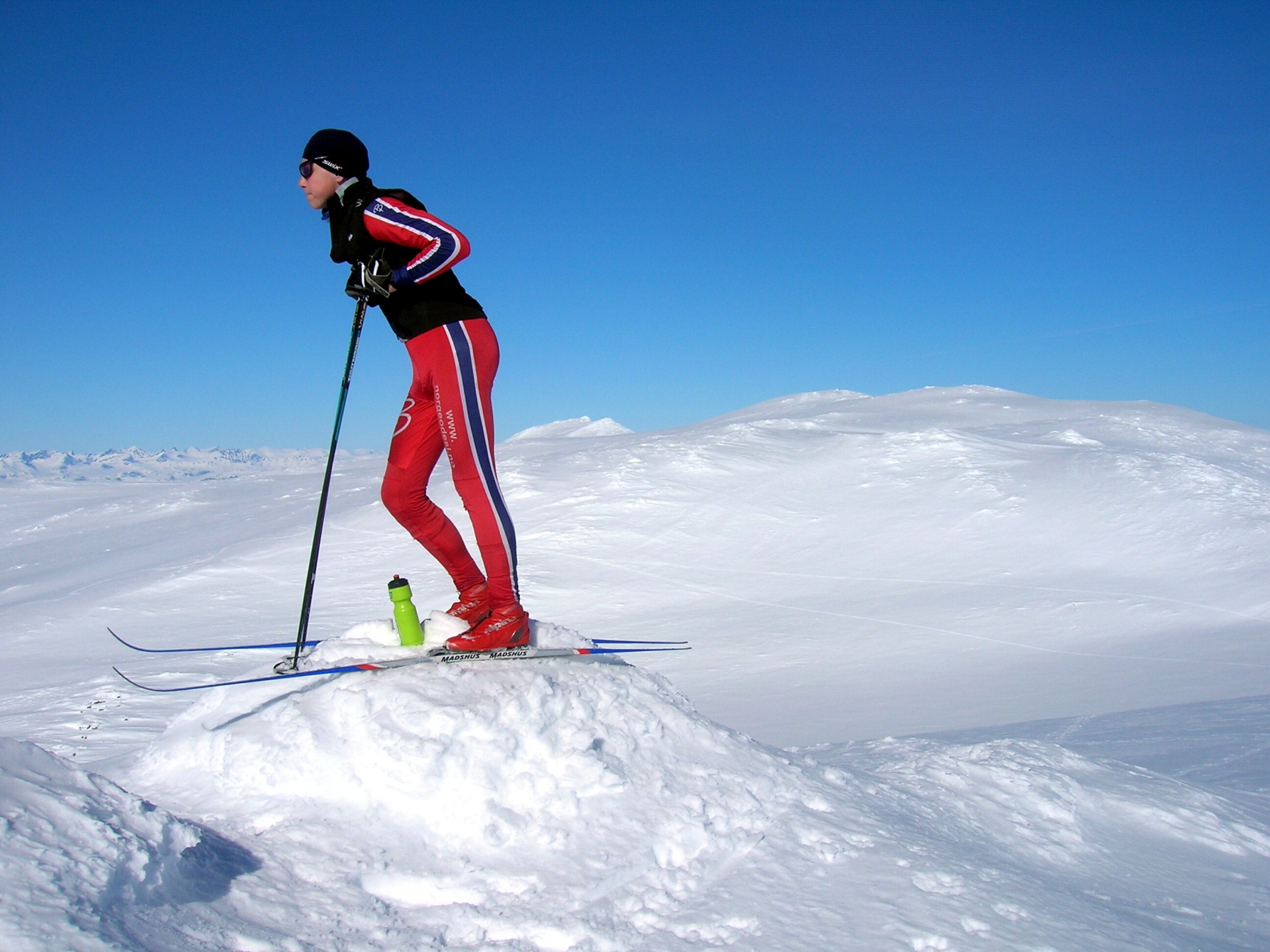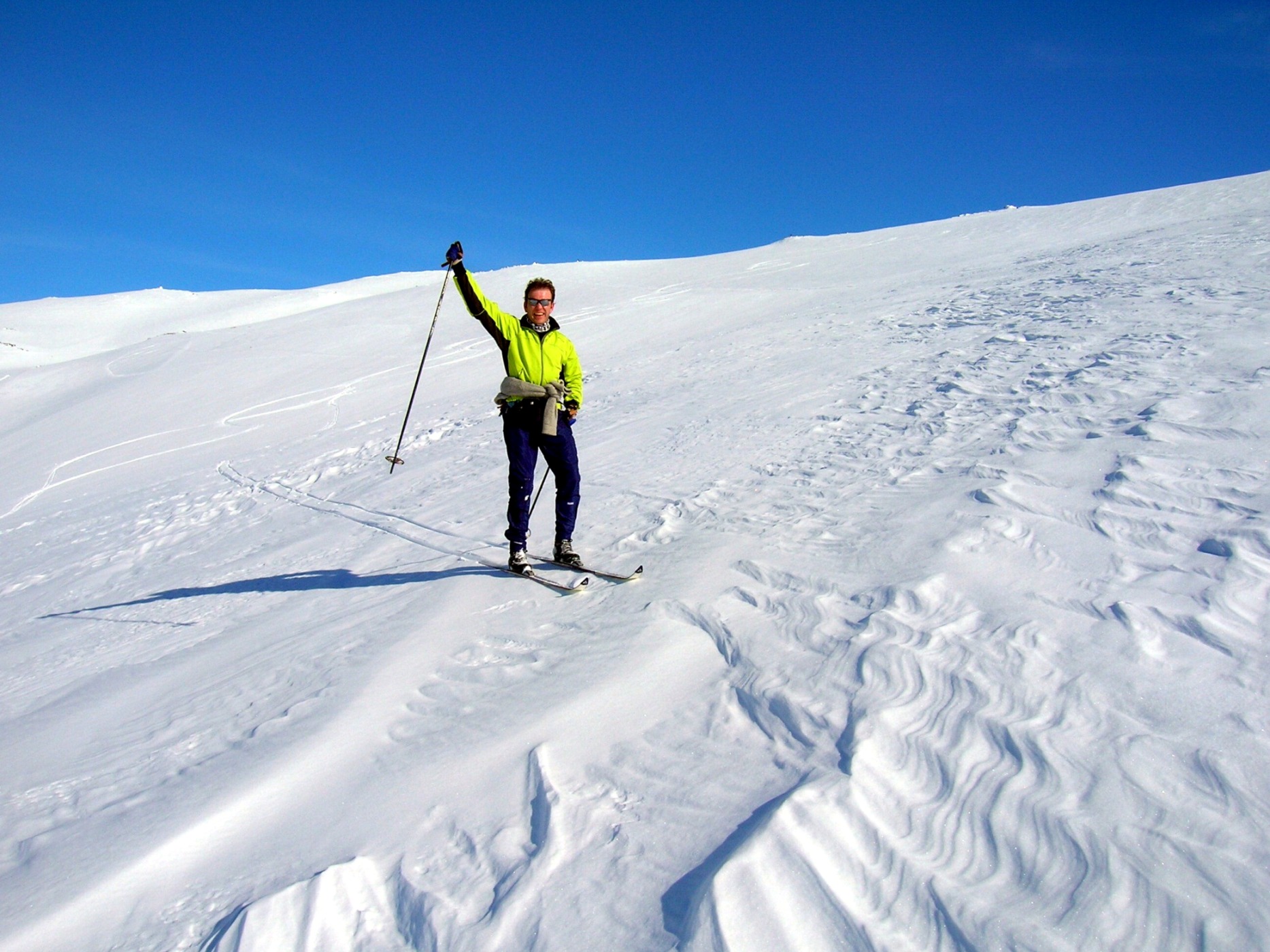500fjell Skrevet 23. april 2008 Skrevet 23. april 2008 Her kommer nok en turrapport fra gromhelgen som var. Kjørte opp til Hallingen Høyfjellshotell på Golsfjellet fredag 18. april, det var en del kø oppover Hallingdal da en god slump skientusiaster skulle legge i vei 38 km fra Finse til Ustaoset. Det var meldt et stabilt høytrykk flere dager framover, så for en gangs skyld var Bestemor beroliget over været Etter en natt på Hallingen dro vi mot Hemsedalsfjellet, der ligger et 1920 meter høyt fjell som heter Høgeloft som jeg egentlig har litt dårlige minner med fra før. Høsten for tre år siden ble jeg møtt med en halv meter snø å vasse i, da ble alternativet Vesle Jukleeggi i stedet. Andre gangen var februar for to-tre år tilbake, da fikk jeg oppleve at Hemsedal sentrum og 1920 moh var to forskjellige verdener! Mine tynne flishansker klarte ikke kuling og 20 minus på toppen, jeg har aldri fryst så mye før, så denne gangen hadde jeg tatt med tykke votter selv om det så ut til at jeg ikke fikk bruk for dem. Vi var fire stykker på turen, og etter å ha parkert bilen på en liten P-plass like før Oset smurte vi oss inn med solfaktor 30 for babyer som det alltid står på slike flasker Vi la i vei over Eldrevatnet og tok sikte på å følge dalen som er vest for Store Jukleeggi. Det var så varmt at jeg kunne gå barkledd og uten stilongs hele turen, virkelig kongevær! Vi smørte skiene med VR 45 og satset på å gå med feller når stigningen begynte for alvor, det var faktisk tørrsnø hele turen. Når vi kom innover dalen fikk vi litt utsikt mot Hurrungane og Skarvheimen, fjellene lå badet i snø som jeg vil tro holder langt ut i månedsskiftet mai/juni! Tro om igjen dere bypakk som ikke tror at det finnes en snøflekk igjen i Norge Fulgte fjellskråningen inn til dalskillet der en elv kommer fra et vann på 1668 moh. Her tok vi en liten pause før vi fortsatte ufortrødent videre i det venstre dalsøkket mot pkt. 1731. Fellene kom godt til nytte, og snøunderlaget var fast og fint å gå på. Når vi kom til vannet 1668 var vi litt usikre på hvor vi skulle gå, men GPSen mente at vi skulle ta sikte mot skaret rett sør for pkt. 1815. Nå kunne vi se toppen, og som vi "fryktet" var vi ikke de eneste som hadde tenkt tanken på en tur på Høgeloft. Vel oppe tok vi en god pause og nøt panoramautsikten mot Jotunheimen, Skarveheimen, til og med Gaustatoppen stakk opp i det fjerne! Vi kunne sitte barkledd på toppen, uten et vindpust og slikke "påske-etter-påske" sola. Vi kunne skimte bort til sommerens mål i Jotunheimen da vi håper å rangle oppå topper som Mjølkedalstind, Falketind og Storen hvertfall Nedturen tok vi over Store Jukleeggi for å få en topp til på lista. Jeg har fortsatt ikke fått meg fjellski, og siden jeg begynner å bli en stor gutt blir det stadig vanskeligere å renne i fjellet på smale Madshus performance langrennski med slitte kanter Resten av turen var bare kos, vi fulgte elva fra vann 1668 og rant jevnt nedover mot Eldrevatnet. Fikk noen herlige renn, selv om de voksne klagde litt over at de ble stive i låra etter all hockeystillingen. Alle var enige om at vi hadde en fin tur på en dag man får et fåtall av i året. Det var deilig med tacos etter turen, og god samvittighet hadde vi alle;) Vis rapporten i Turkartet Vis større kart